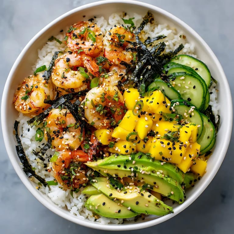 These avocado shrimp rice bowls bring together succulent shrimp, fluffy jasmine or sushi rice, and a punchy mango salsa for a delicious fusion meal. Topped with creamy avocados, crisp cucumber, and a sprinkle of toasted sesame seeds, each bowl offers a vibrant balance of flavors and textures. The shrimp is cooked simply with olive oil, lime, and smoked paprika, while the rice gets a touch of vinegar seasoning. Perfect for quick assembly, these bowls are easily adapted: substitute cauliflower rice for a lighter option, or add extras like edamame or nori for nuance. Serve with lime wedges for extra zing.