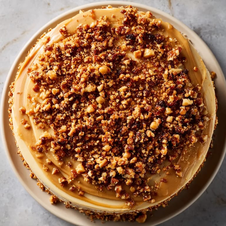 Keep the cake covered at room temperature for up to two days or refrigerate if storing longer. Bring slices to room temp before serving for the best texture. Store the caramel crunch topping separately in an airtight container if making ahead so it stays crisp and does not soften from humidity.