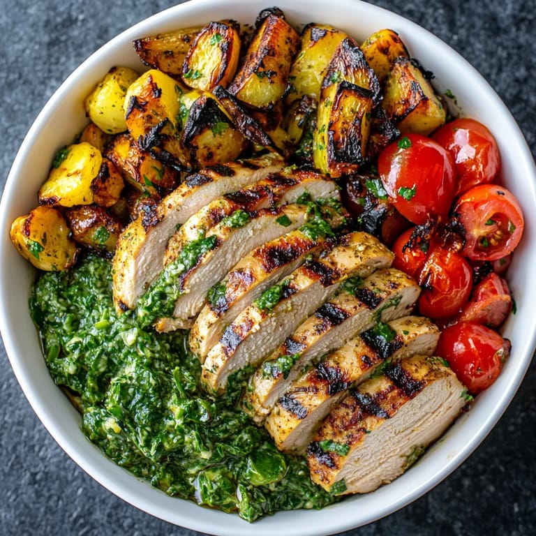 Save It This Chimichurri Grilled Chicken Bowl with Garlic Sauce is a staple for those nights when ordinary meals just won't do. With juicy grilled chicken cloaked in tangy, herbaceous chimichurri, paired with creamy garlic sauce, sautéed greens, and vibrant bursts of roasted veggies and fresh tomatoes, it's a nourishing bowl full of bold flavors. Whether you are meal-prepping for the week or making a showstopper for dinner, this recipe brings energy and freshness to your table.