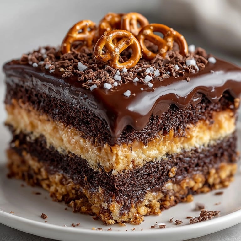 Sheet cakes are a true American classic from church gatherings and potlucks to birthday parties. The combination of chocolate and pretzels taps into America's love for sweet-and-salty snacks while the ganache topping nods at European pastry tradition. It is a celebration in every bite.