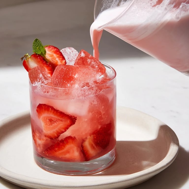 - Gently pour the pink mixture over the ice and strawberries, watching it fill the glass in that gorgeous gradient of pink. A quick stir brings everything together and releases the strawberry aroma.