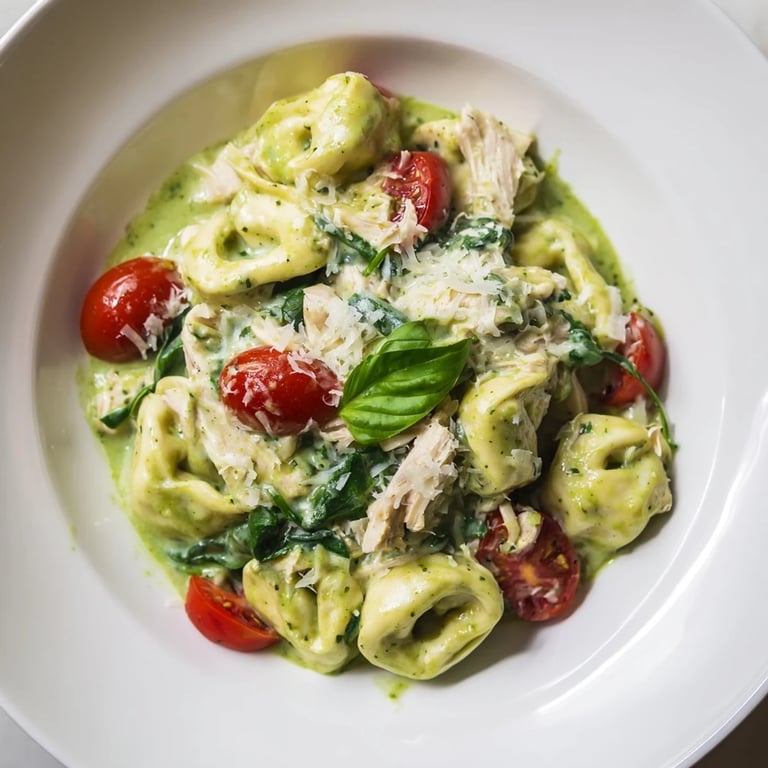 - Add the shredded rotisserie chicken and cooked tortellini to the skillet, tossing everything together until evenly coated in that gorgeous green sauce.