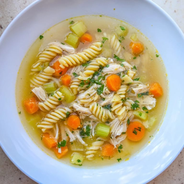 This dish features tender shredded chicken combined with soft carrots, celery, garlic, and twirly noodles in a richly flavored broth simmered slowly to meld all the flavors. Aromatics like rosemary and bay leaf provide depth, while freshly chopped parsley brightens the warm, hearty bowl. Preparing this involves layering fresh ingredients and cooking gently over hours, resulting in a satisfying and nourishing main course perfect for cozy days.