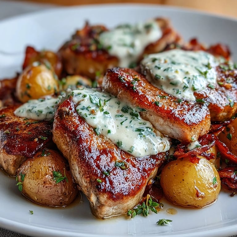 Serve these pork chops hot, generously spooning the creamy ranch gravy over both the meat and the vegetables. Leftovers can be refrigerated for up to 3–4 days. If you prefer to meal prep, you can assemble the seasoned chops and sauce in a freezer bag to thaw and cook later.