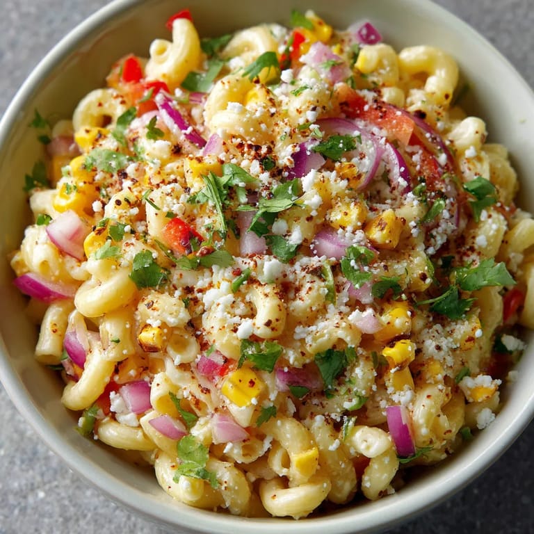 This dish blends al dente pasta with sweet corn, crunchy red bell pepper, red onion, and fresh cilantro. The creamy dressing, a lively mix of mayonnaise, sour cream, lime juice, chili powder, and garlic powder, infuses each bite with tangy and smoky notes. Generous crumbles of cotija cheese finish the salad for a savory, salty element. After a quick chill, this refreshing salad is ready to serve, garnished with extra cotija and cilantro. It pairs beautifully with grilled meats or can be enjoyed on its own as a satisfying vegetarian option.