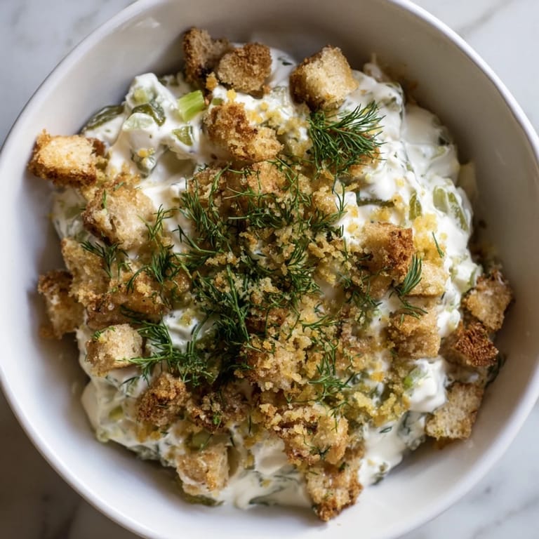 This creamy and tangy dip blends softened cream cheese, sour cream, and mayonnaise with finely chopped dill pickles and fresh herbs. The mixture is seasoned with garlic, onion powder, black pepper, smoked paprika, and a hint of ranch seasoning. A crispy panko topping, toasted in butter and lightly seasoned, adds a delightful crunch. Serve chilled with chips, pretzels, or fresh veggie sticks for an irresistible appetizer that’s quick to prepare and packs bold flavors.