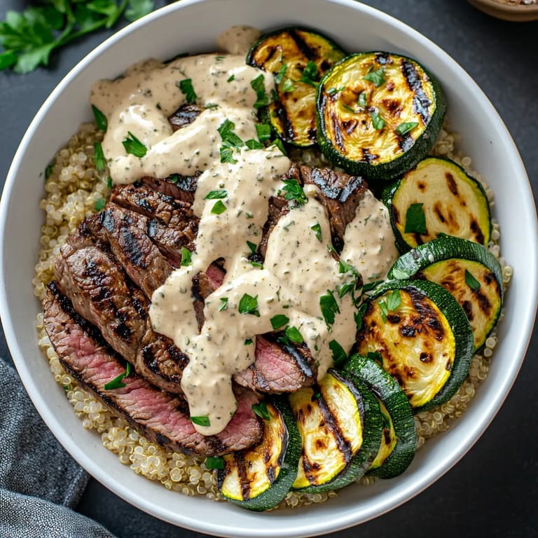Save It This Grilled Steak Bowl with Creamy Sauce and Grilled Zucchini is my go-to dinner when I want something protein-packed that feels like a treat but comes together fast. Juicy steak slices layered over warm fluffy quinoa get paired with smoky zucchini fresh off the grill and a drizzle of garlicky cream sauce. For busy weeknights, meal prep, or even a special weekend meal, this bowl always tastes like restaurant food—without the fuss.