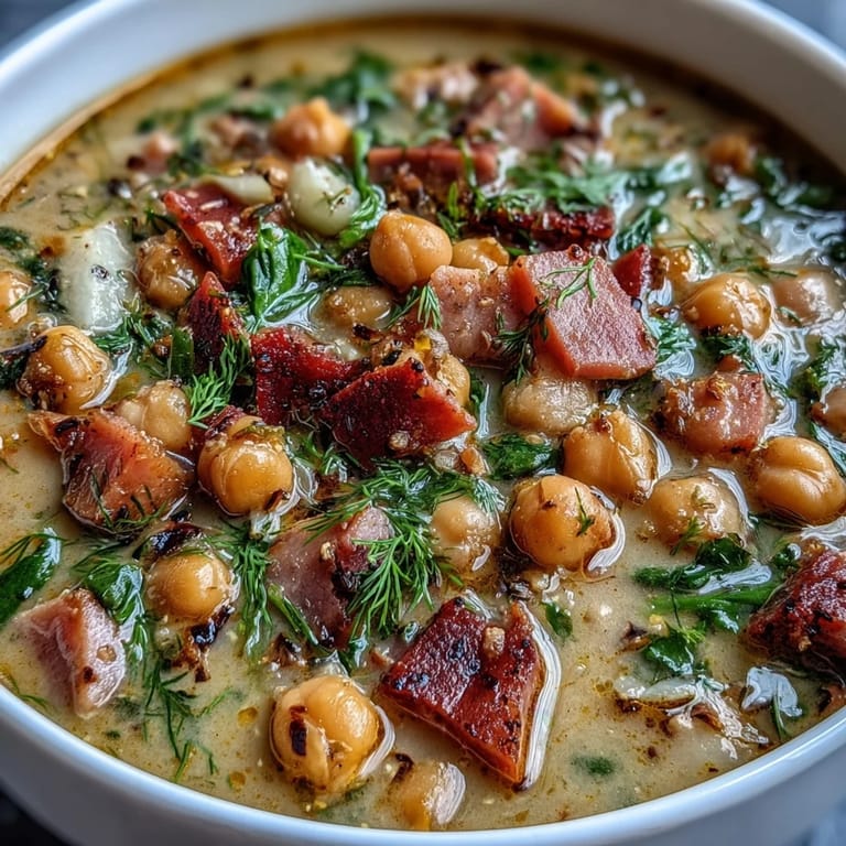 Hearty soup with tender ham, creamy chickpeas, fresh dill, and bright lemon notes for a cozy meal.