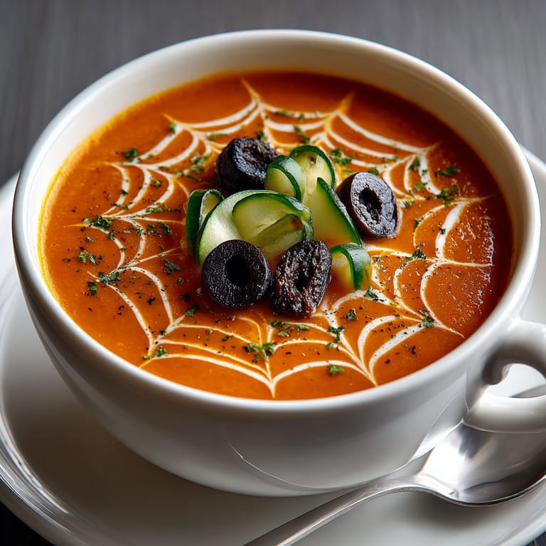 To make this a freezer friendly meal let the soup cool after blending but before adding any garnish. Freeze in individual portions. Thaw overnight in the fridge or gently reheat from frozen on the stove. Only add the spiderweb and spider decorations just before serving so they stay sharp and festive.