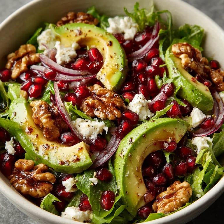 Pomegranate is a symbol of festivity in many cultures and is often used in Middle Eastern salads. Its vivid color and tart sweetness have made it popular in winter dishes for generations. Combining it with avocado gives this salad a modern fresh twist that bridges global flavor traditions.