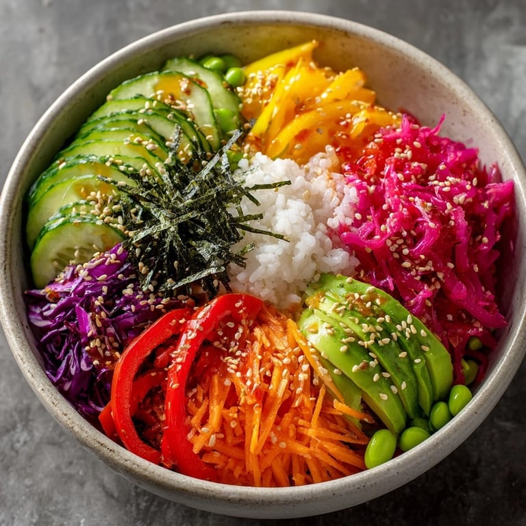 Enjoy a vibrant bowl filled with seasoned sushi rice, crisp vegetables, and a zesty dressing. This Japanese-inspired dish layers fresh cucumber, carrot, avocado, red bell pepper, edamame, and cabbage over perfectly cooked rice, with garnishes of pickled ginger, nori, and toasted sesame seeds. The sweet-salty dressing ties everything together for a nourishing meal that's easy to assemble and naturally gluten-free if using tamari. Make it your own by adding your favorite proteins or swapping in seasonal vegetables.