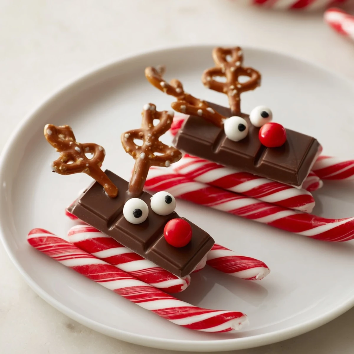 Save It Festive, fun, and delightfully sweet, these no-bake Rudolph Candy Cane Sleds are a whimsical holiday treat perfect for kids parties or edible gifts.