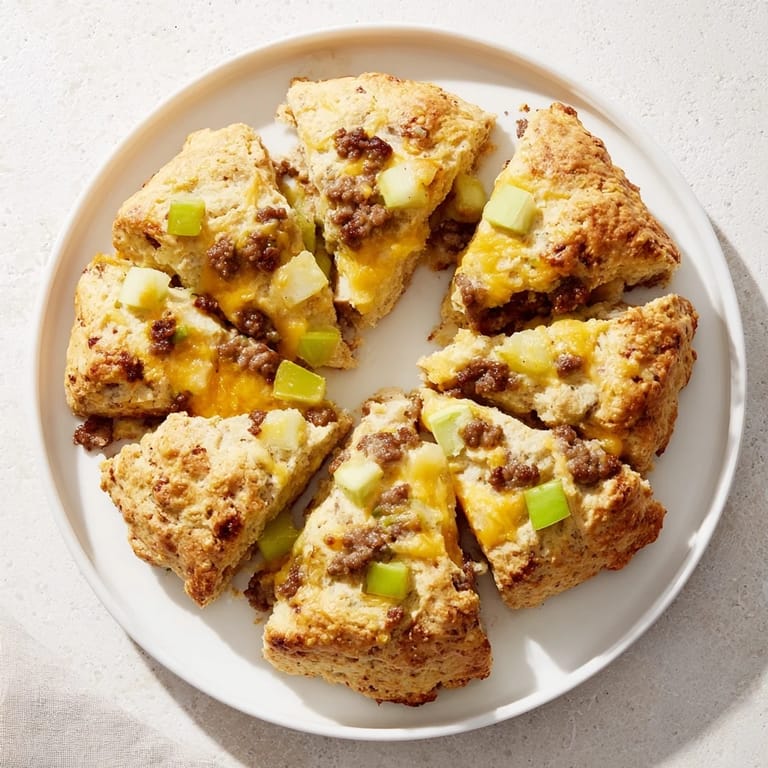 Save It A hearty, rustic skillet scone featuring juicy apples, savory sausage, and sharp cheddar baked to golden perfection — ideal for brunch or a cozy supper.