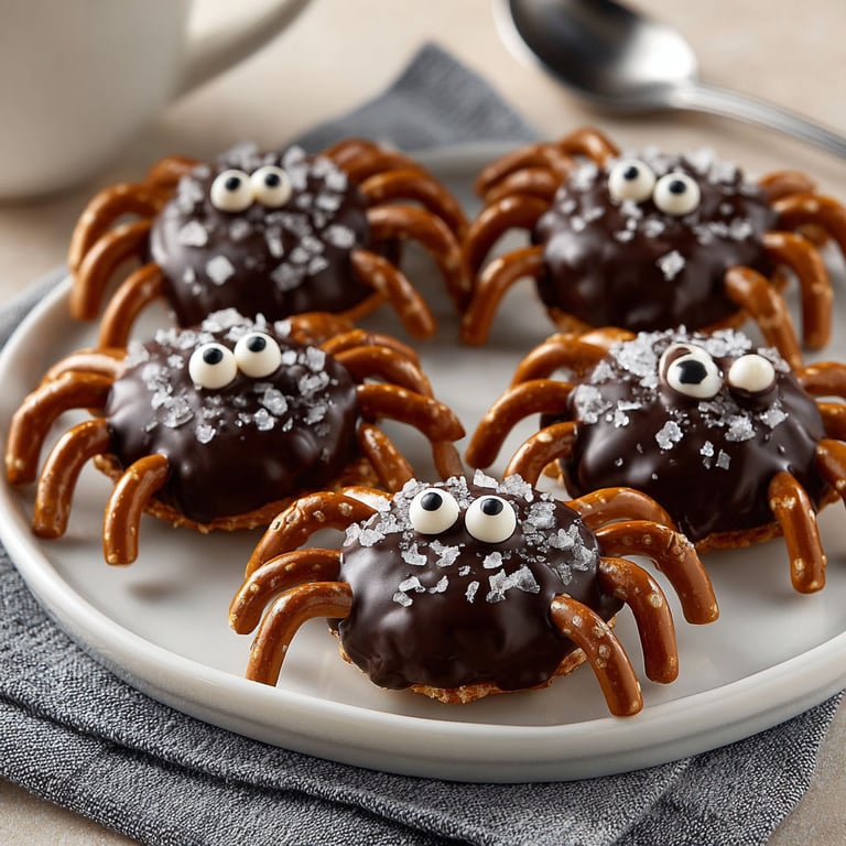 Save It These Sea Salt Dark Chocolate Spider Pretzels are the ultimate whimsical treat for Halloween tables or any party that needs a little sweet and salty crunch. Mini pretzels become spider bodies, dipped in silky dark chocolate and finished with sea salt and candy eyes for a playful bite that thrills both kids and grownups.