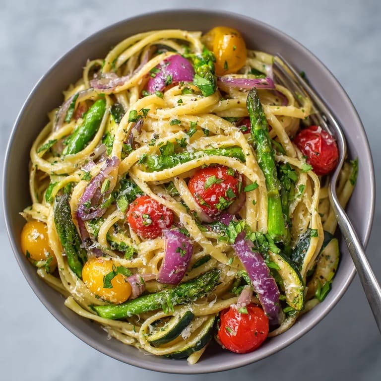 This one-pot wonder combines al dente linguine with a colorful medley of spring vegetables including asparagus, snap peas, zucchini, and cherry tomatoes. The pasta cooks directly in vegetable broth, absorbing the flavors while creating a silky sauce enhanced with lemon, Parmesan, and fresh herbs. Ready in just 30 minutes with minimal cleanup, this Italian-inspired dish offers a perfect balance of freshness and comfort. The technique creates a naturally creamy texture without heavy cream, making it a satisfying yet light option for a quick weeknight dinner that celebrates seasonal produce.