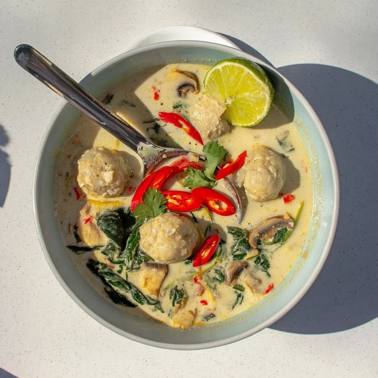 A fragrant comforting soup featuring tender meatballs simmered in a rich coconut broth with Thai herbs and vegetables. Perfect for a cozy meal with vibrant flavors.