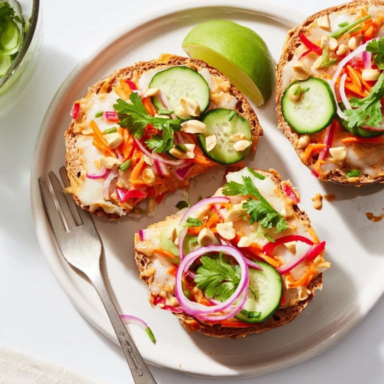 These Thai-inspired bagel halves are the perfect fusion snack, bringing together creamy peanut sauce, colorful vegetables, and gooey cheese. After a quick prep and bake, you’ll enjoy bagels loaded with shredded carrot, bell pepper, cucumber, onion, bean sprouts, and fresh cilantro. Roasted peanuts and green onion add flavor and crunch. It’s easy to swap vegetables with your favorites, and options like vegan cheese or maple syrup create a plant-based variation. Serve hot from the oven, paired with lime wedges and your favorite refreshing drink for a satisfying, fun twist any night.