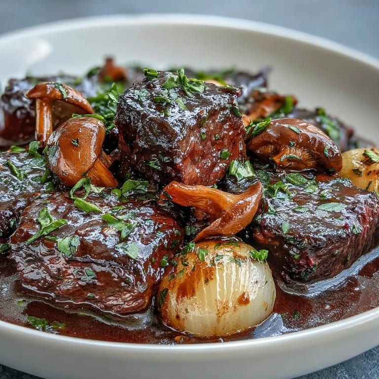 There's a certain magic that happens when you braise beef low and slow with wine, mushrooms, and time. I discovered this version on a gray November afternoon when a friend mentioned she'd splurged on fresh chanterelles at the market, and suddenly the classic French dish felt like it needed reinventing. What started as curiosity about combining those earthy mushrooms with beef became an obsession—the kind where you keep tweaking and tasting until everyone at the table stops talking mid-bite. That's when you know you've found something worth making again and again.