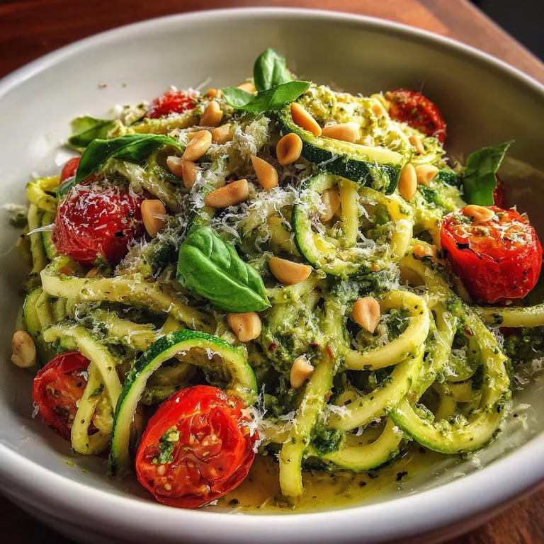 This vibrant Italian-inspired dish combines spiralized zucchini noodles with a creamy homemade basil pesto and sweet cherry tomatoes. Ready in just 15 minutes, it's a low-carb, vegetarian, and gluten-free main course perfect for hot summer days with no cooking required. The pesto blends fresh basil, Parmesan, pine nuts, garlic, and olive oil, coating every ribbon of zucchini. Finish with juicy tomatoes and extra basil for color and flavor. Ideal for a quick lunch or elegant dinner, enjoy immediately for the best texture and taste.