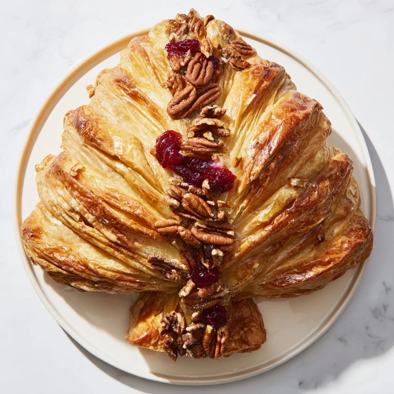 Save It A festive, elegantly wrapped brie cheese, baked in golden puff pastry shaped like a pine tree, filled with cranberry sauce and toasted pecans—perfect for holiday gatherings.