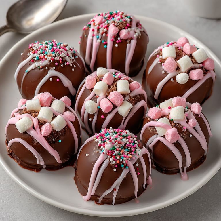 - Color melted white chocolate with a drop of red or pink food coloring. Drizzle the tinted chocolate over each bomb with a spoon or piping bag. Top with sprinkles or edible glitter for a festive flourish.