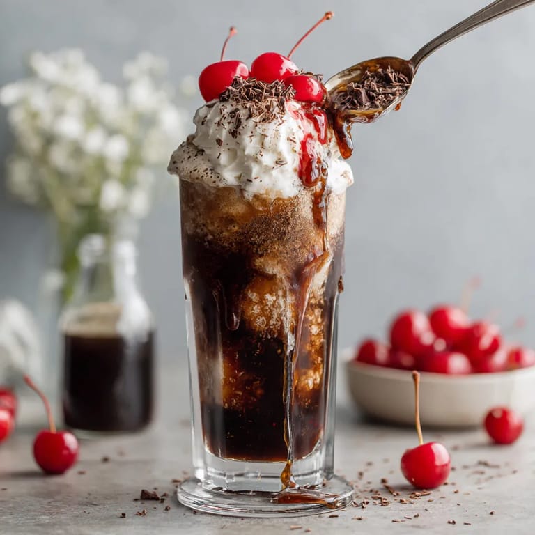 - Slowly pour chilled cherry cola over the ice cream Watch for frothing and let the bubbles settle before topping off to avoid overflow and maximize foam