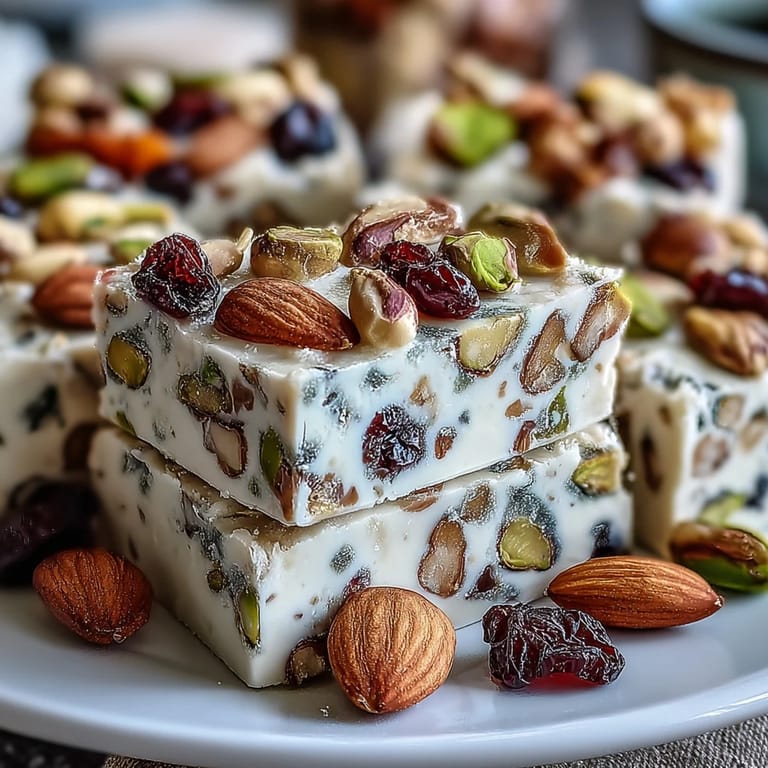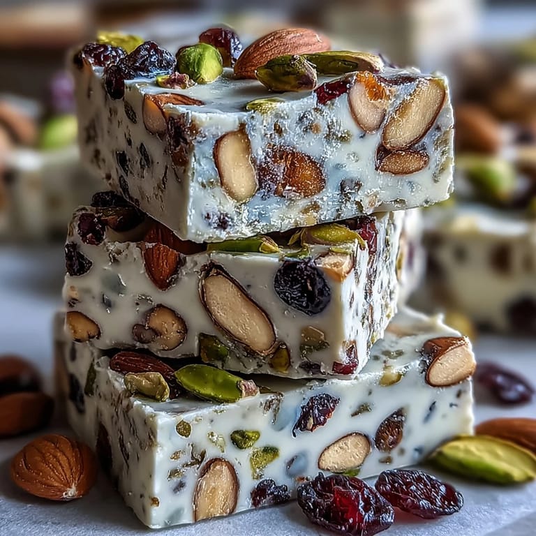 Save It My neighbor brought over a box of pistachio nougat from a Mediterranean market, and I was struck by how each piece tasted like an entire afternoon in Provence. The chewy texture gave way to bursts of roasted nuts and tart-sweet fruit, and I found myself asking for the recipe before the box was even half empty. What started as curiosity became obsession, and after some trial and error in my kitchen, I finally cracked the code. Now whenever I make a batch, the whole house fills with this warm, toasty aroma that makes everyone pause and ask what's happening.