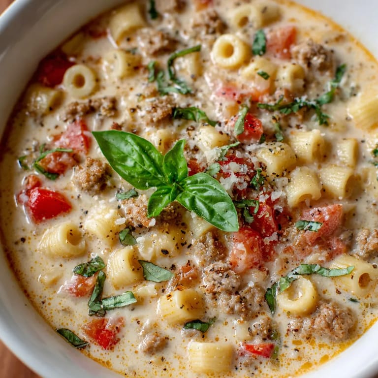This soup riffs on classic Italian comfort food by blending ingredients like sausage, tomato, pasta, and cheese in a single pot. Creamy soups of this style are more common in American Italian kitchens where richness and easy assembly are prized for family meals. Ditalini pasta is often used in minestra or minestrone in Southern Italy giving this soup an authentic nod with a creamy twist.
