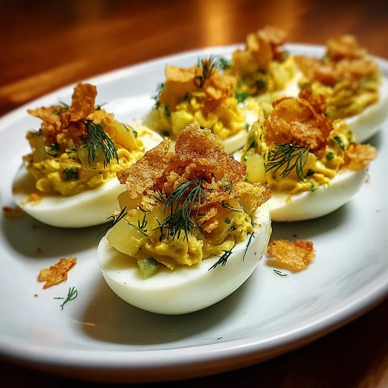 Deviled eggs are an American classic with roots in European stuffed eggs The addition of dill pickles and crunchy chips gives a nod to the Midwest where all things brined are beloved This version merges time-honored comfort with a playful modern spark