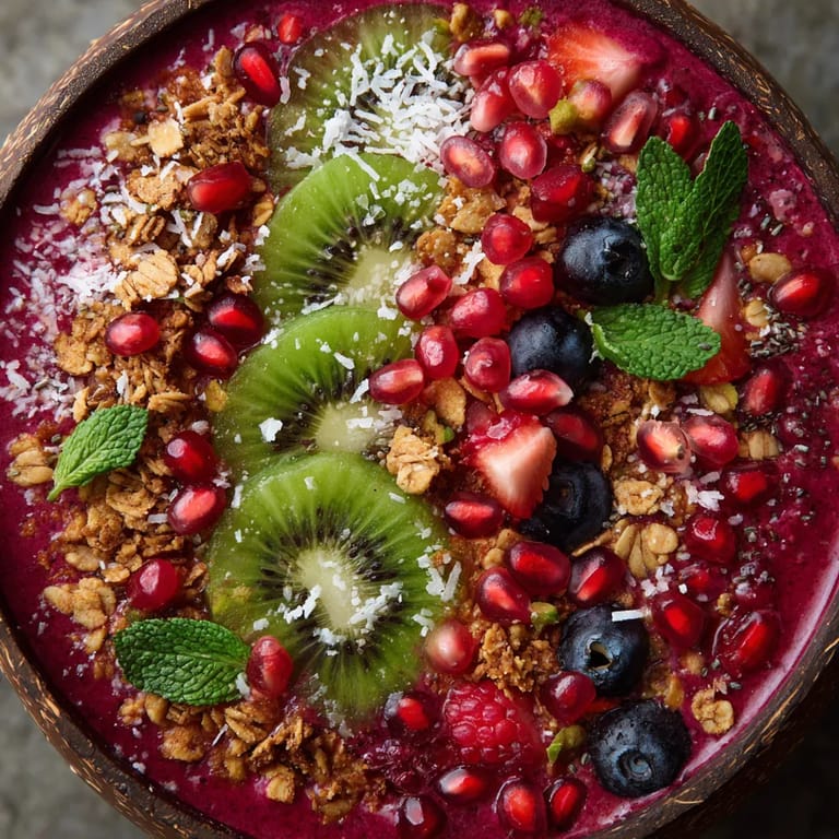 - Arrange kiwi slices, berries, granola, coconut flakes, mixed seeds, and optional pomegranate seeds in sections or pretty patterns on top. I let my kids design their own arrangements for fun.