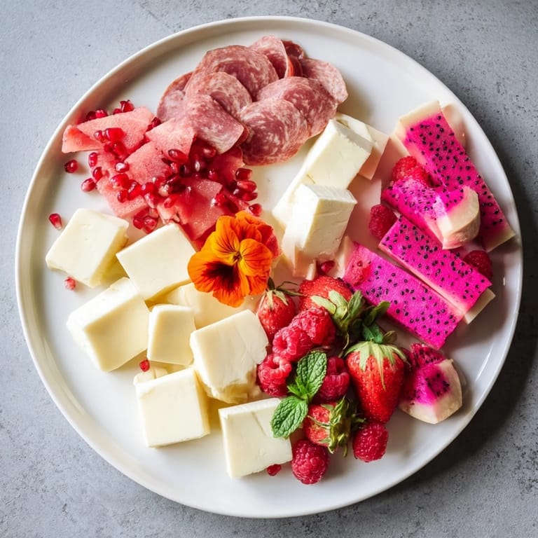 - Fruits: 1 cup pink dragon fruit, cubed, 1 cup strawberries, halved, 1 cup watermelon, cut into flamingo shapes (use cookie cutter optional), 1 cup fresh raspberries, 1/2 cup pomegranate seeds