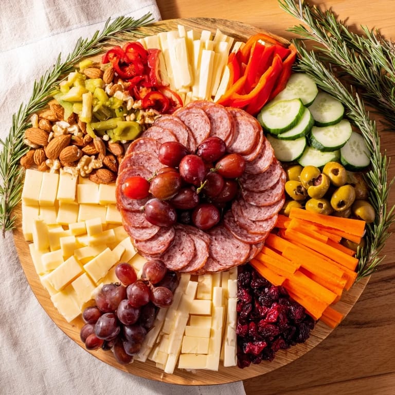 - Charcuterie (omit for vegetarian): 100 g prosciutto folded, 100 g salami sliced