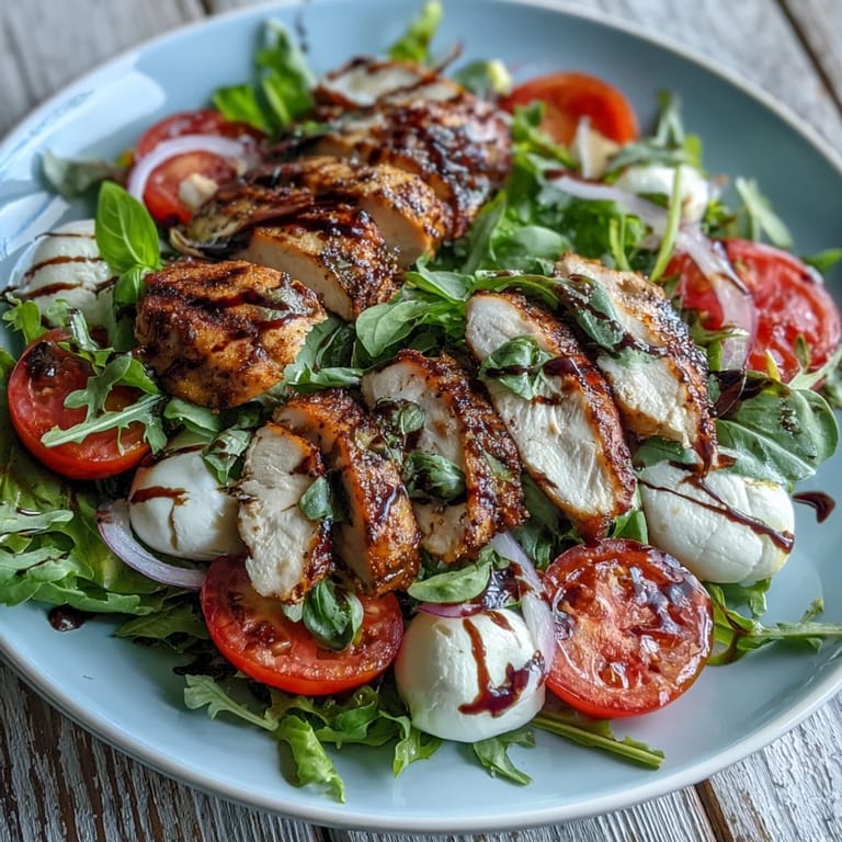 This dish makes sense in warm months when tomatoes taste like tomatoes and fresh mozzarella feels refreshing rather than heavy. The grilled chicken adds protein without weighing you down, and the balsamic glaze provides richness that doesn't require cream or thick dressings. It's the kind of meal that makes you feel virtuous while tasting entirely indulgent.