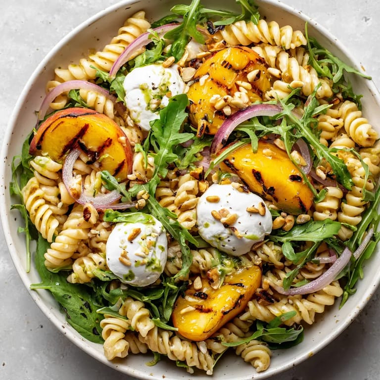 - Place the cooked pasta in a large bowl. Add the sliced grilled peaches, arugula or spinach, shallot and most of the basil. Drizzle the vinaigrette evenly and toss gently until everything is coated.