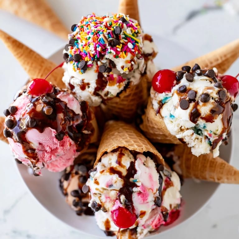 Save It A playful and vibrant dessert platter featuring an array of ice cream cones, toppings, and accompaniments—perfect for parties or family gatherings.