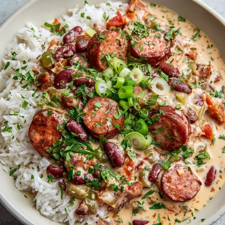 - Spoon creamy beans and sausage over a bed of hot rice. Shower with chopped parsley and fresh spring onions for color, crunch, and brightness.