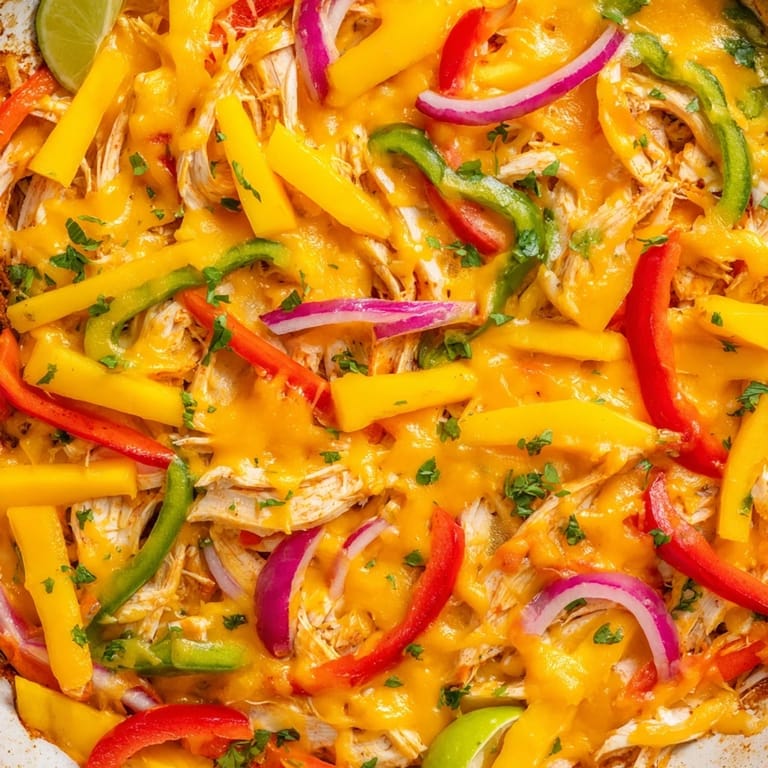 Save It A vibrant, Tex-Mex-inspired casserole featuring juicy chicken, sweet mango, colorful bell peppers, and classic fajita spices, all baked to perfection for a family-friendly meal.