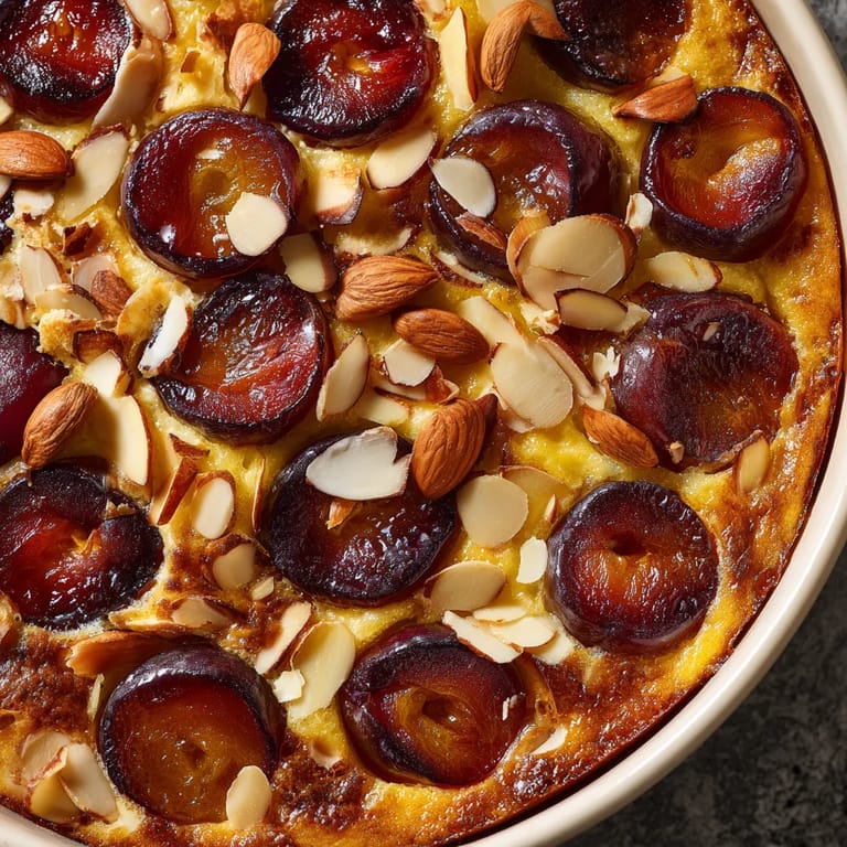- Carefully pour the batter over the arranged plums, letting it flow gently so the fruit stays in place. Scatter sliced almonds evenly on top for a crunchy finish.