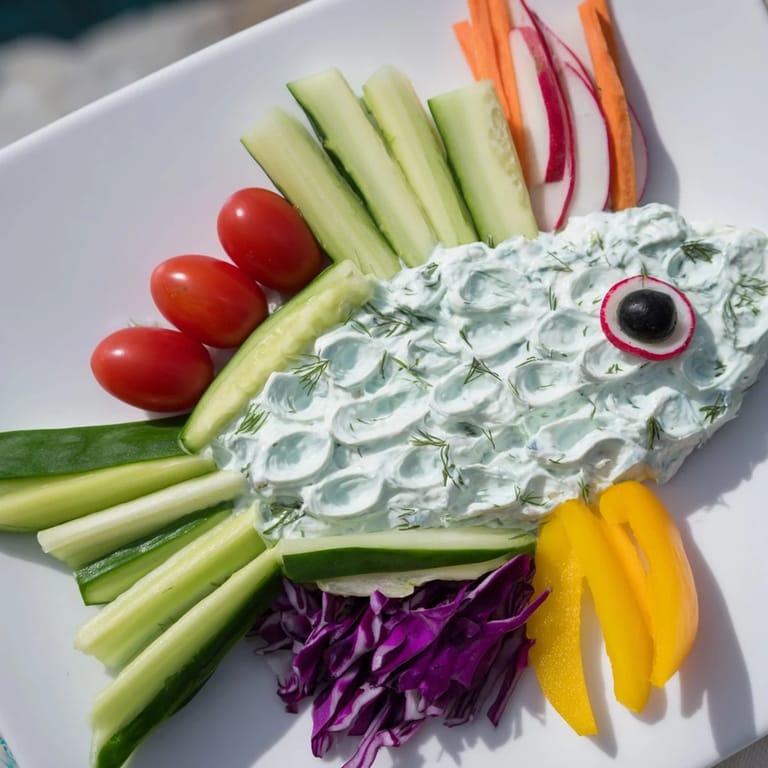 Save It A whimsical, ocean-inspired appetizer featuring creamy, herbed dips and fresh vegetables, artfully arranged in a fish shape. Perfect for parties and gatherings.