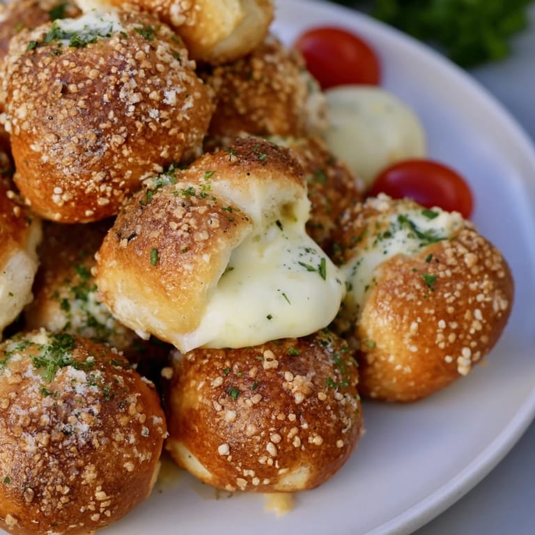 The pretzel bites are briefly dipped in a boiling baking soda solution before baking. This alkaline bath creates the chewy crust with that classic pretzel flavor and golden color.
