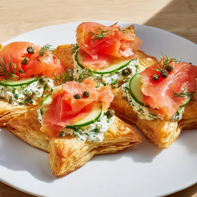 Save It A festive and elegant platter featuring savory puff pastry stars, smoked salmon, and fresh herbed cream cheese, perfect for celebrating the end of the year.