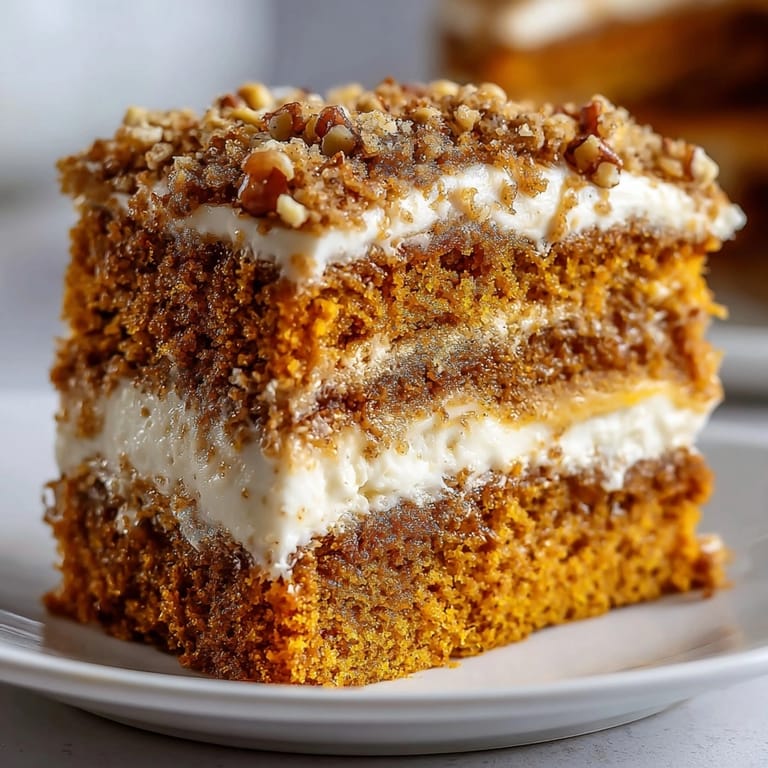 This cake keeps well at room temperature for a day but it is best to refrigerate if storing longer. Wrap the pan tightly or transfer slices to an airtight container. The cream cheese layer will stay fresh for up to five days chilled. Bring to room temperature before serving so the texture and spice bloom again.