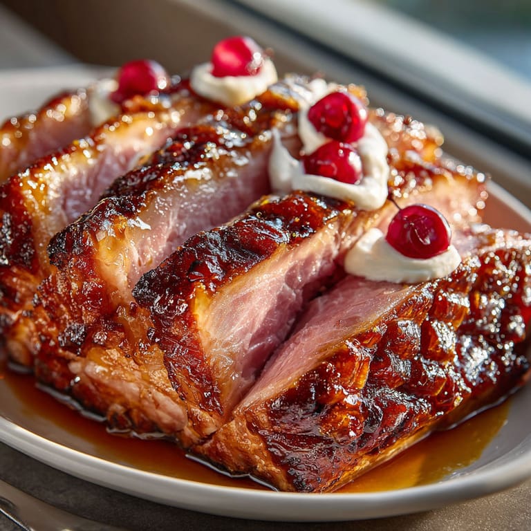 Serve thick slices beside roasted potatoes and green beans or next to a bright salad. The glaze pairs especially well with tangy or mustard dressed greens. Leftovers are fantastic in breakfast hash or tucked inside warm biscuits with a dab of extra glaze.