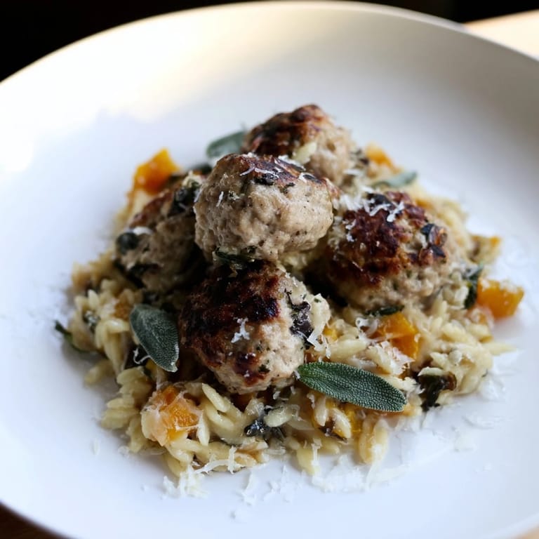 Incorporate fresh sage, egg, and breadcrumbs gently into the turkey mixture. Avoid overmixing to maintain tenderness. Simmering the meatballs in the pumpkin orzo liquid also keeps them juicy.
