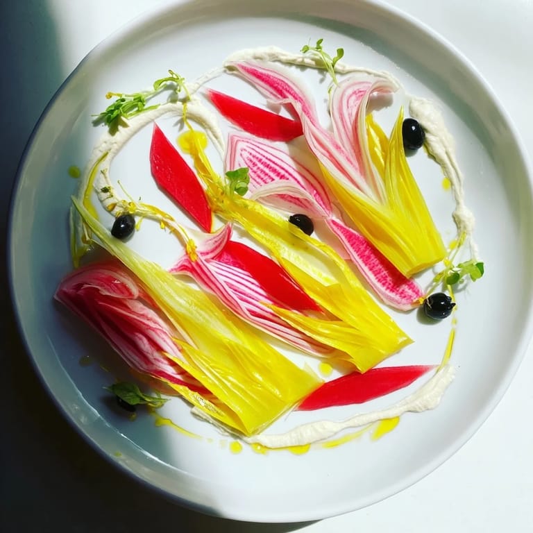 This dish exists in the space where modern plating meets vegetable-forward cooking with real respect for ingredients. There's no hidden sauce masking flavors, no technique deployed just to show off. Instead, contrast does the work: dark against light, bitter against sweet, raw and fresh against the earthiness of roasted or raw roots. It's the kind of appetizer that makes people lean in and ask questions, which is really what we're after when we cook for others.