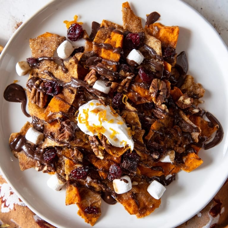 - Place the cinnamon-sugar tortilla chips in a heap on a wide serving platter forming a bed for all the toppings Scatter the roasted sweet potato cubes over the chips distributing them evenly for color and flavor in every bite Add dried cranberries toasted pecans and mini marshmallows over the top for tart chew creamy crunch and gooey meltiness Drizzle the warm maple-chili chocolate sauce slowly and generously over all the toppings so each chip picks up a bit of everything Finish with a dollop of whipped cream and a sprinkle of fresh orange zest if desired for a creamy citrusy lift Serve your dessert nachos immediately while the sauce is warm and the chips are still crisp