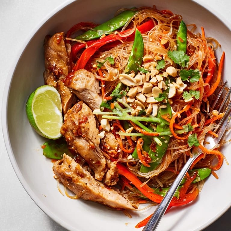 You can easily make this vegetarian by using firm tofu instead of chicken. Marinate cubes of tofu in the same sauce as the chicken for twenty minutes before sautéing until golden. For a gluten-free version ensure your soy sauce is tamari-based and check the labels on fish sauce and noodles. Try cashews in place of peanuts if there is a nut allergy.
