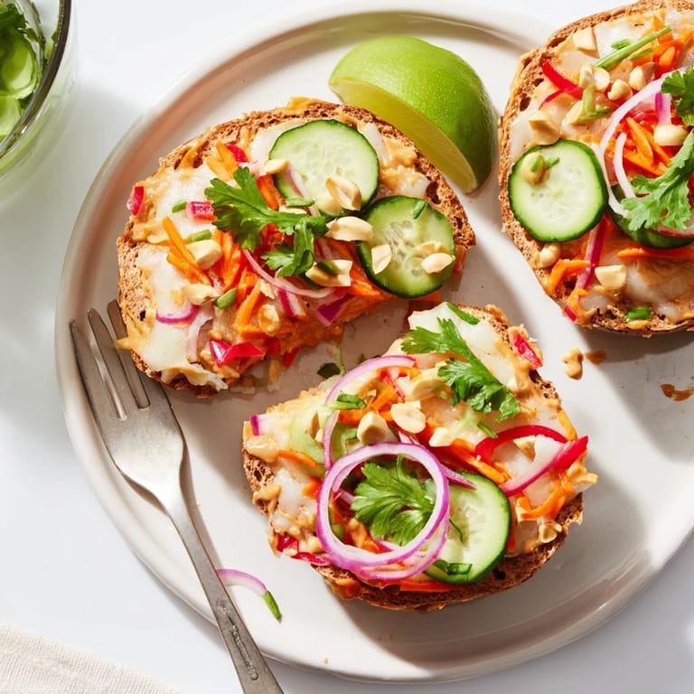 Save It A vibrant fusion snack featuring creamy Thai peanut sauce, colorful vegetables, and melty cheese on toasted bagel halves. It's a quick, satisfying twist on pizza night that brings big flavor to busy evenings.