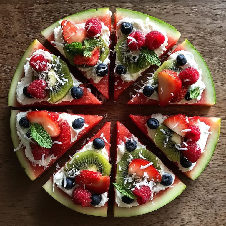 Save It This playful Watermelon Pizza brings together all the joys of summer snacking in a single, juicy slice. Imagine cold wedges of sweet watermelon topped with a creamy layer of yogurt and finished with a mosaic of sliced berries and fresh fruit. Not only does it brighten any table but it is an ideal healthy dessert for parties picnics or a fun after-school treat.