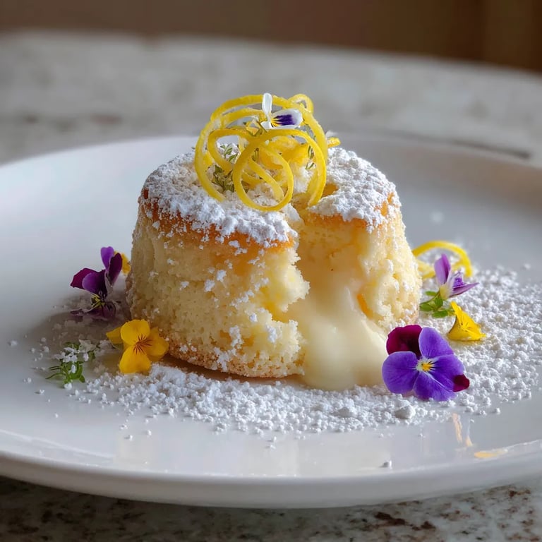 - Allow cakes to rest for only two minutes, then gently loosen the edges with a knife and invert onto plates; top with lemon zest curls, edible flowers, and powdered sugar. Serve right away while they are warm and luscious inside.